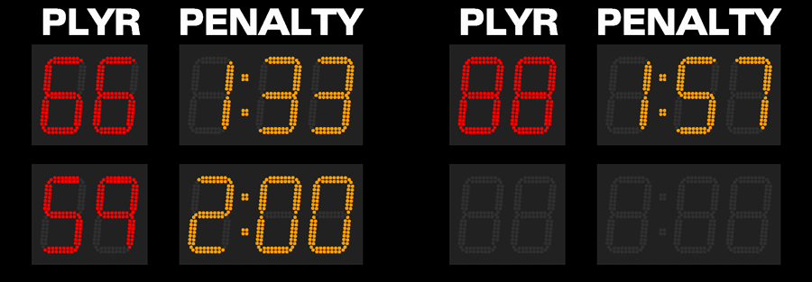 This indoor/outdoor LED hockey electronic scoreboard provides wireless scoring capabilities, and includes two-line PLAYER PENALTY information. Weather-proof digits and electronics are housed in a powder-coated aluminum chassis, which provides excellent corrosion resistance. Each hockey scoreboard is shipped as one piece for ease of handling and installation.