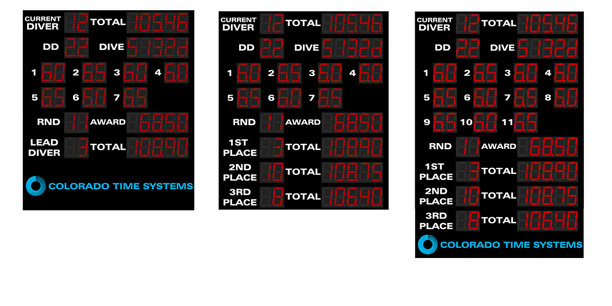 OTTER 3-judge diving electronic scoreboard with current diver and total, dive difficulty, dive number, round, award, and lead diver (MS-0189)